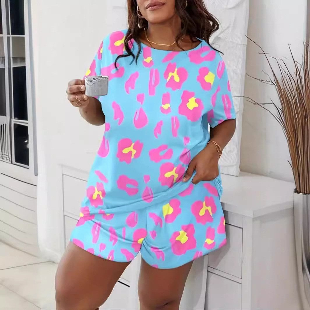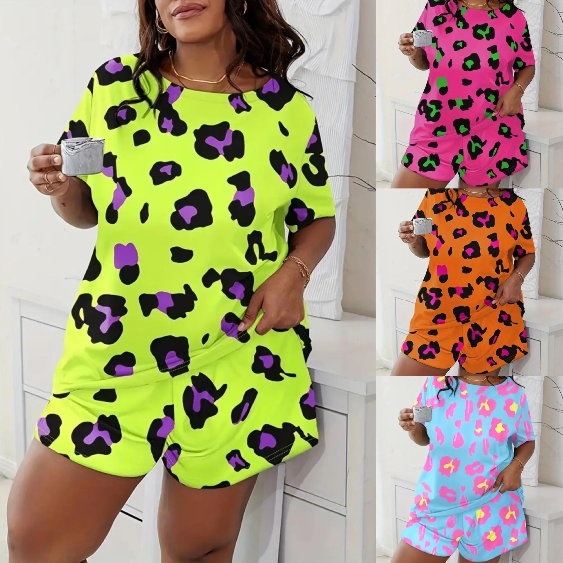 This leopard print set features a round neck short-sleeved top paired with matching shorts, offering a bold yet comfortable outfit choice. Designed with attention to fit and fabric quality, it provides breathability and ease of movement. The striking leopard pattern adds a fashionable edge, perfect for casual wear or stylish lounging. This coordinated set delivers both practicality and trend-forward appeal for confident, everyday style.